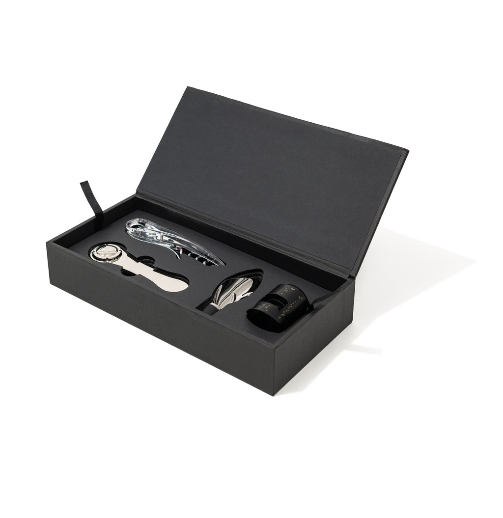 - Contient 4 accessoires essentiels : tire-bouchon Soft Machine Crystal, verseur feuille, pince à bouchon de champagne, bouchon Gard’Bulles métal