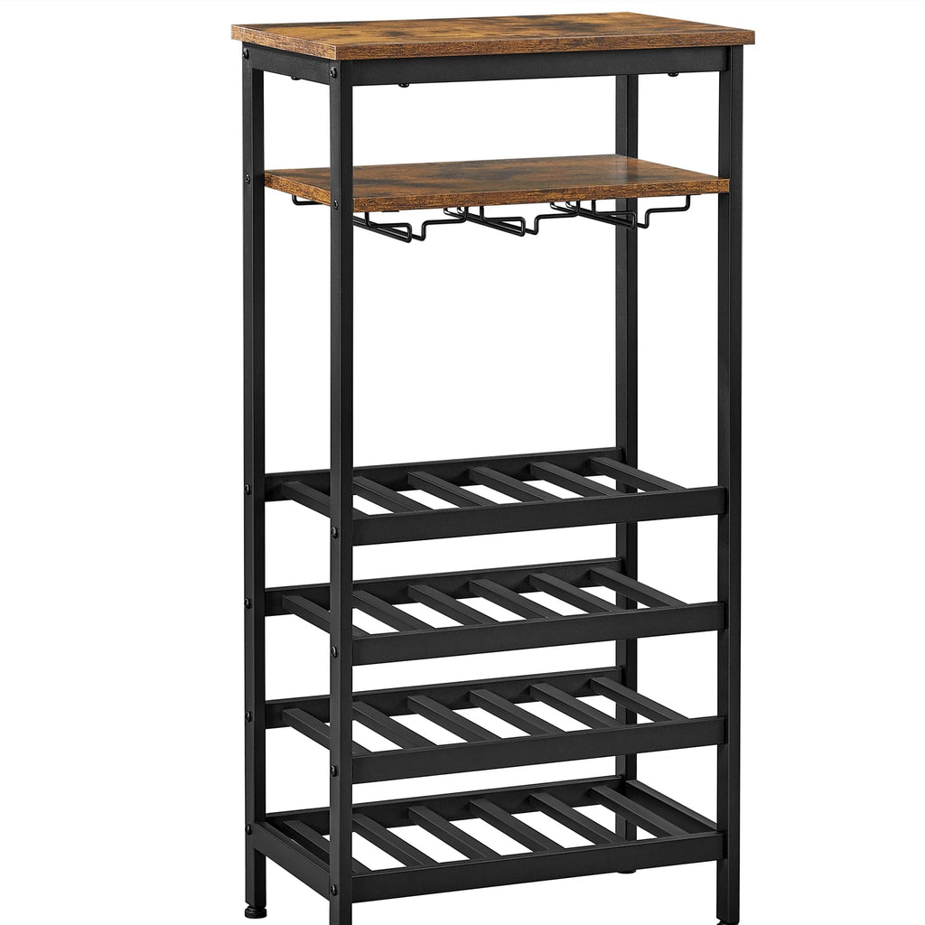 Apportez du caractère à votre intérieur avec ce meuble porte-bouteilles au design industriel, pensé pour allier esthétique et fonctionnalité. Composé d’une structure en acier noir mat et de plateaux en bois brun effet vieilli, il offre un équilibre parfait entre chaleur rustique et modernité urbaine. Avec une capacité de 20 bouteilles, un porte-verres suspendu pour 8 verres à pied, et un plateau supérieur robuste (jusqu’à 25 kg), il devient un véritable coin bar à portée de main, toujours prêt à accueillir vos moments de dégustation.