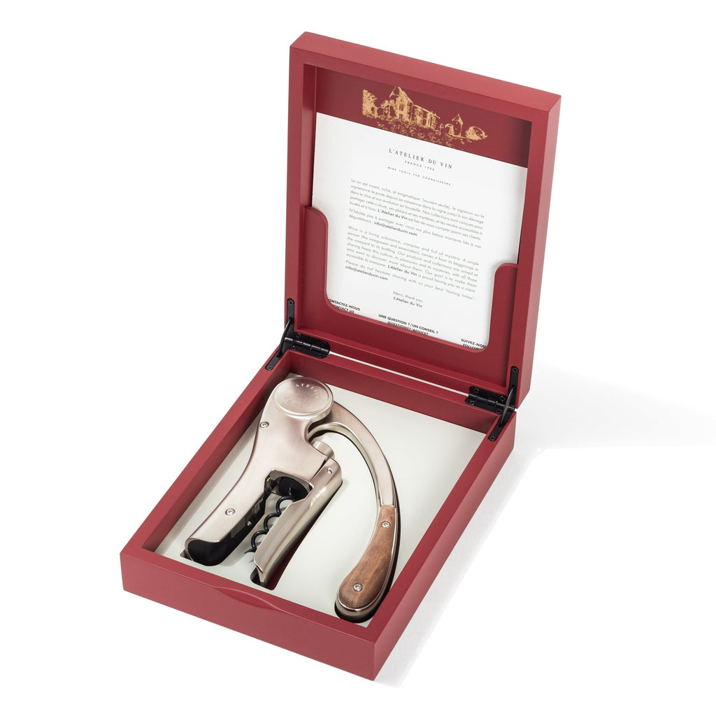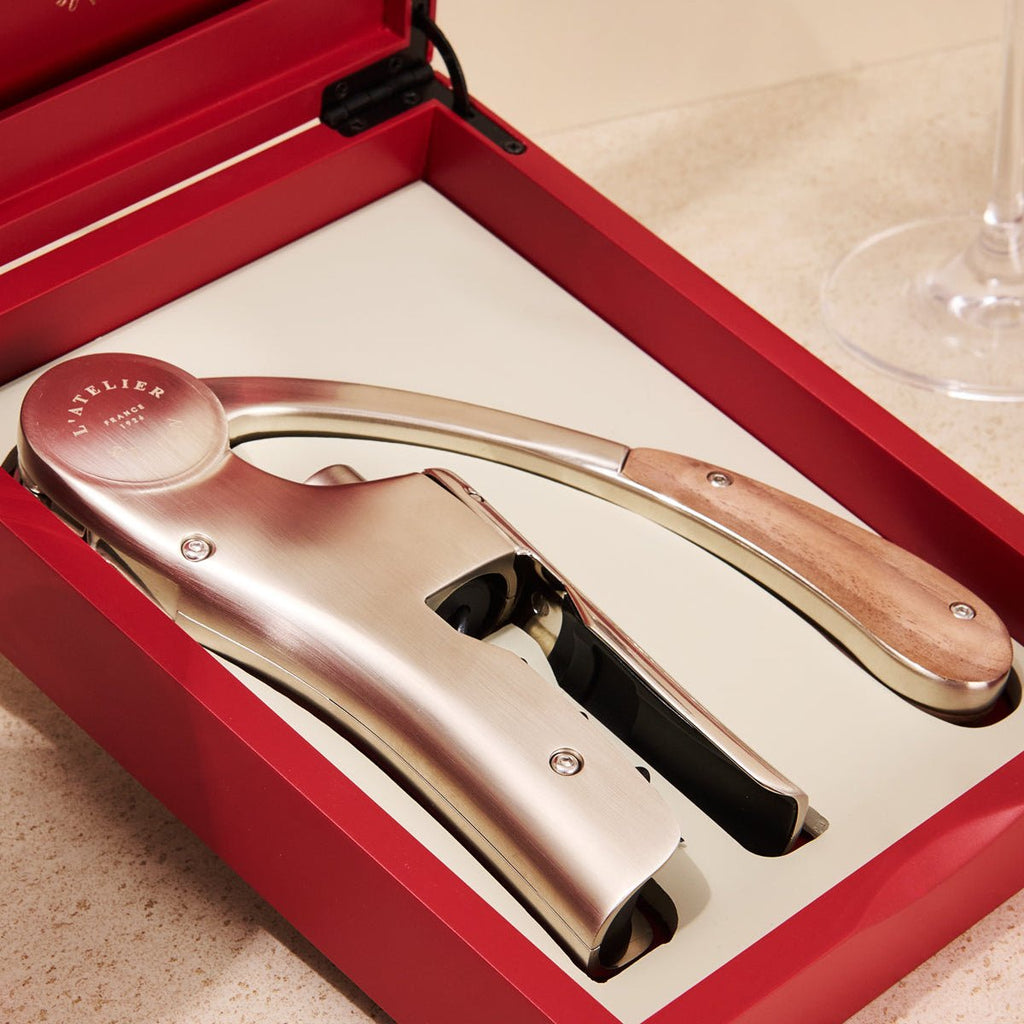 L’Oeno Motion Trésor est bien plus qu’un simple tire-bouchon : c’est une véritable œuvre d’art œnologique, pensée pour les amateurs de vins d’exception. Présenté dans un coffret en bois laqué rouge, aux finitions gravées au laserrappelant les malles anciennes, ce bijou signé L’Atelier du Vin incarne l’élégance et le raffinement. Son mécanisme à levier, forgé en métal ultra-résistant et orné d’un noyer massif patiné, offre une prise en main ergonomique et une ouverture de bouteille fluide et précise. Apprécié depuis plus de 15 ans par les œnologues et sommeliers, ce tire-bouchon allie tradition artisanale, innovation technique et durabilité. Il cache également un espace secret dans le couvercle pour conserver vos souvenirs de dégustation. Chaque pièce est unique et peut être personnalisée, faisant de l’Oeno Motion Trésor un cadeau d’exception, aussi symbolique qu’intemporel.